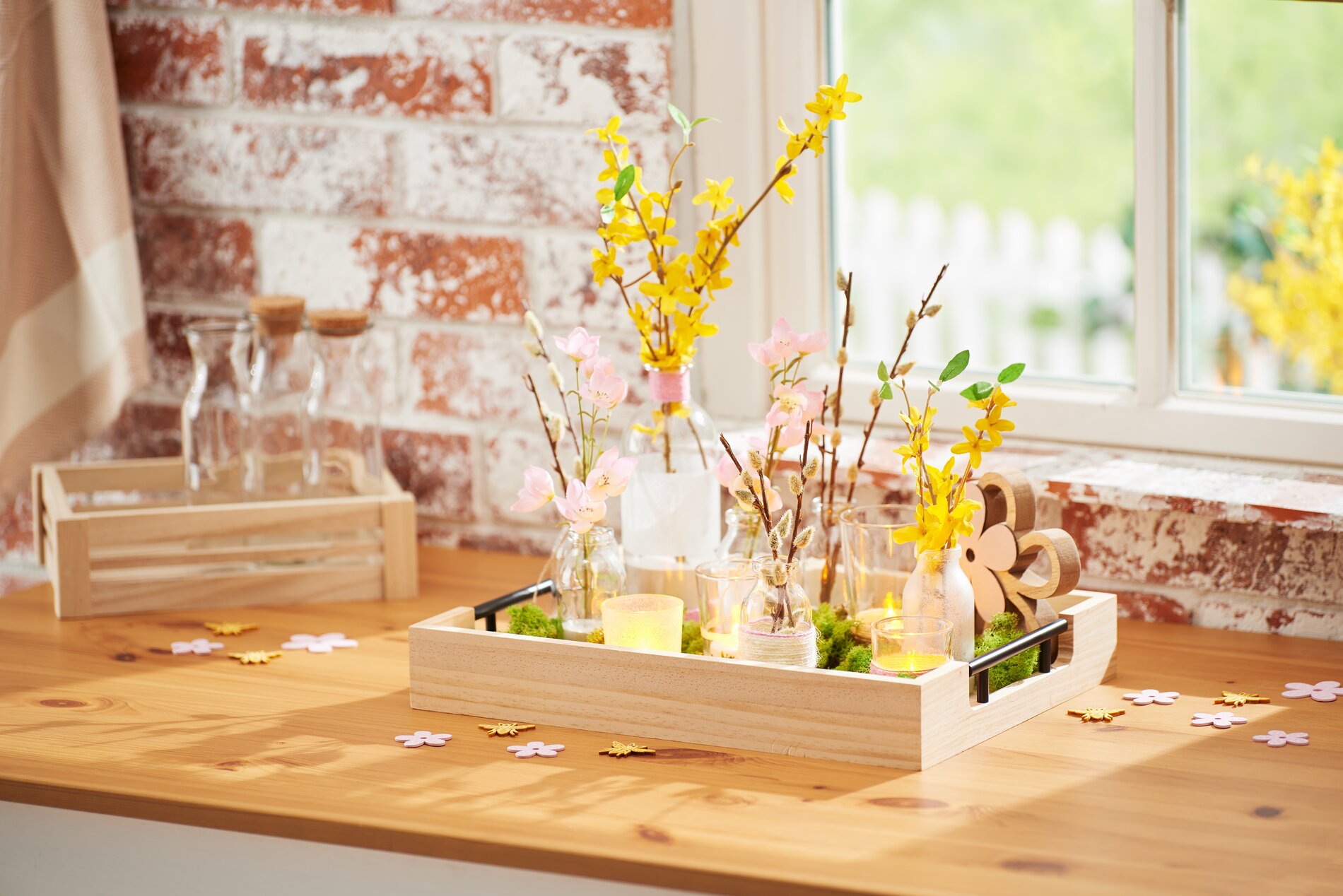 Fill the vases with some colored sand (for a firmer stand). Trim the artificial flowers with the side cutter and place them in the vases. Place tea lights in the tea light jars and arrange everything on a tray.