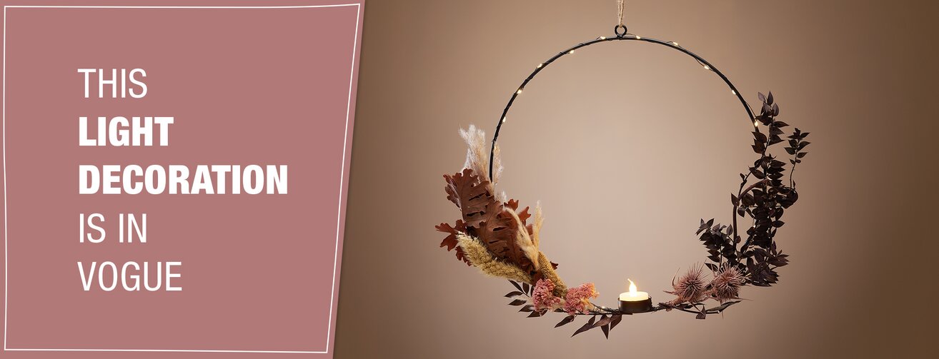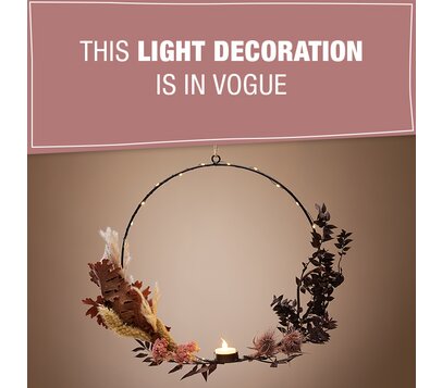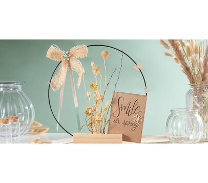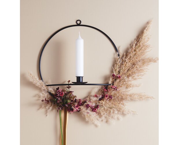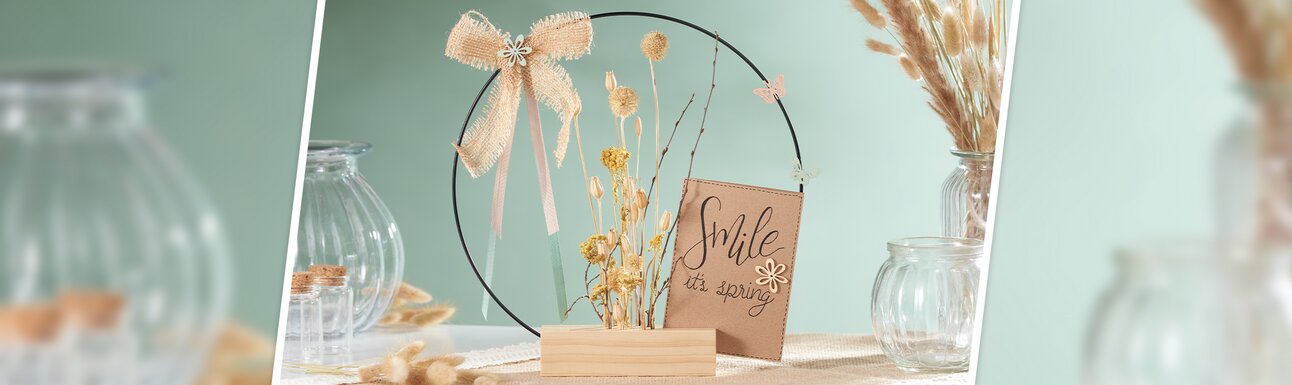 Transform plain metal rings into impressive decorative elements for your home. With artificial flowers and plants, dried flowers, decorative pendants, wooden balls, ribbon bows and much more, you can give your metal rings their special look.