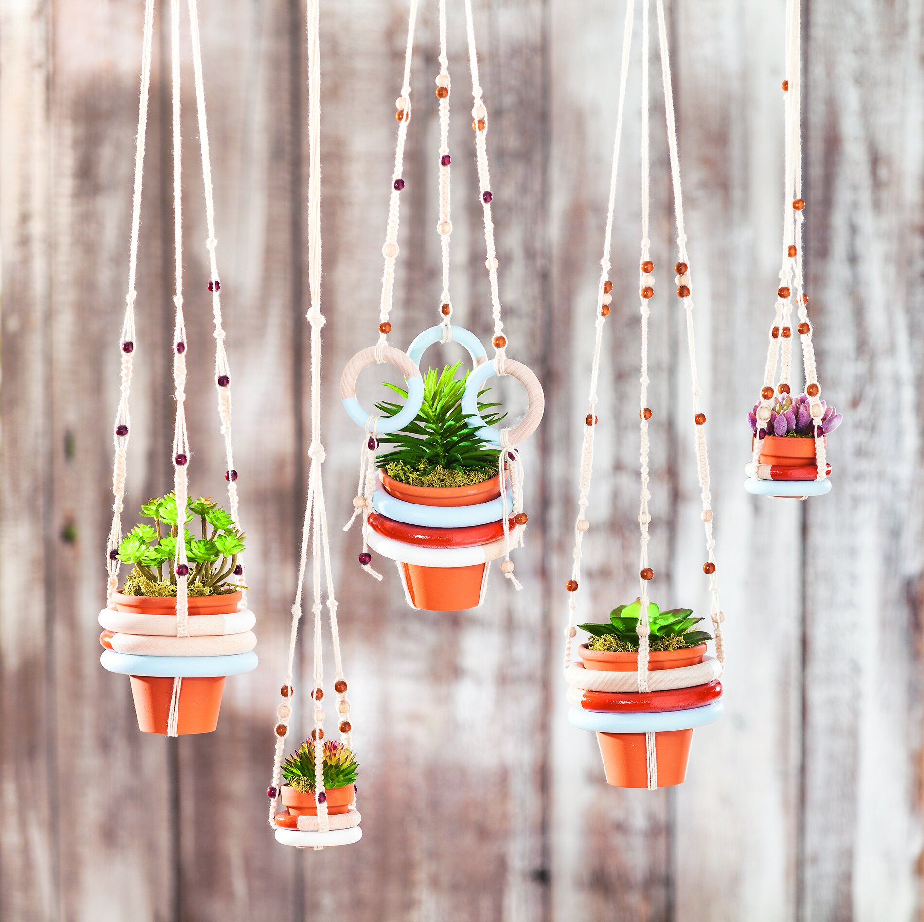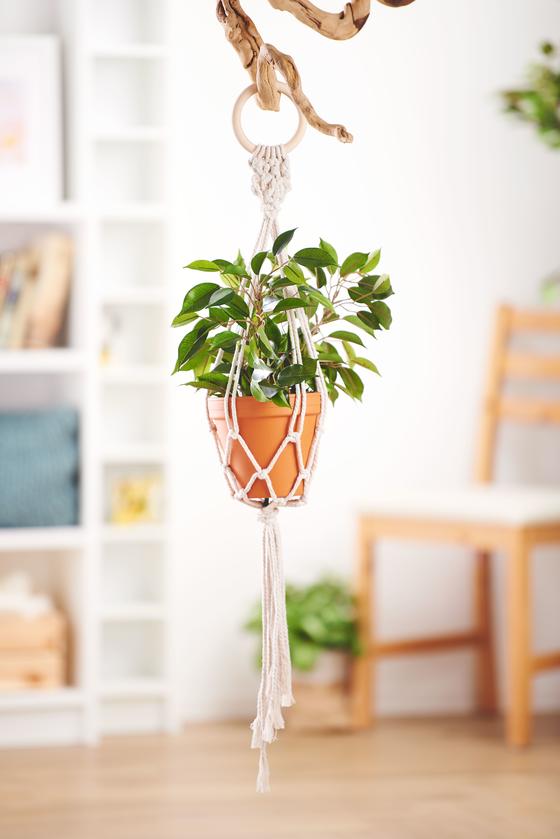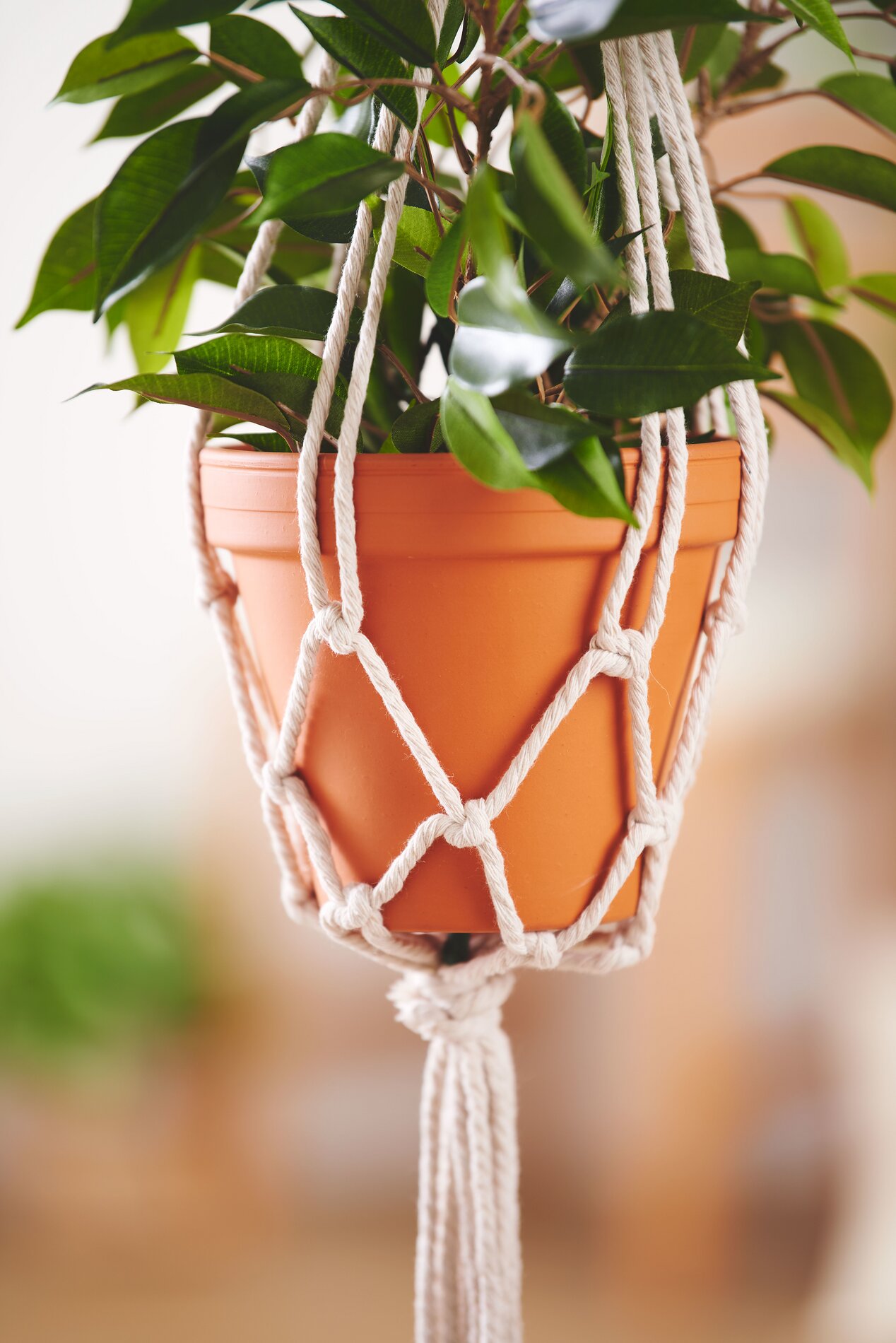 Place your flower pot under the threads as a test and use the flower to determine the length of the thread to the next knot. Now knot two threads together. Set another row of knots always with the right and left thread of the last row of knots. This way you get the great grid pattern.