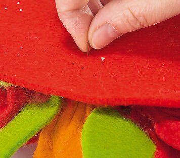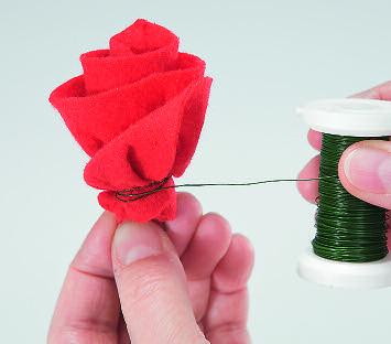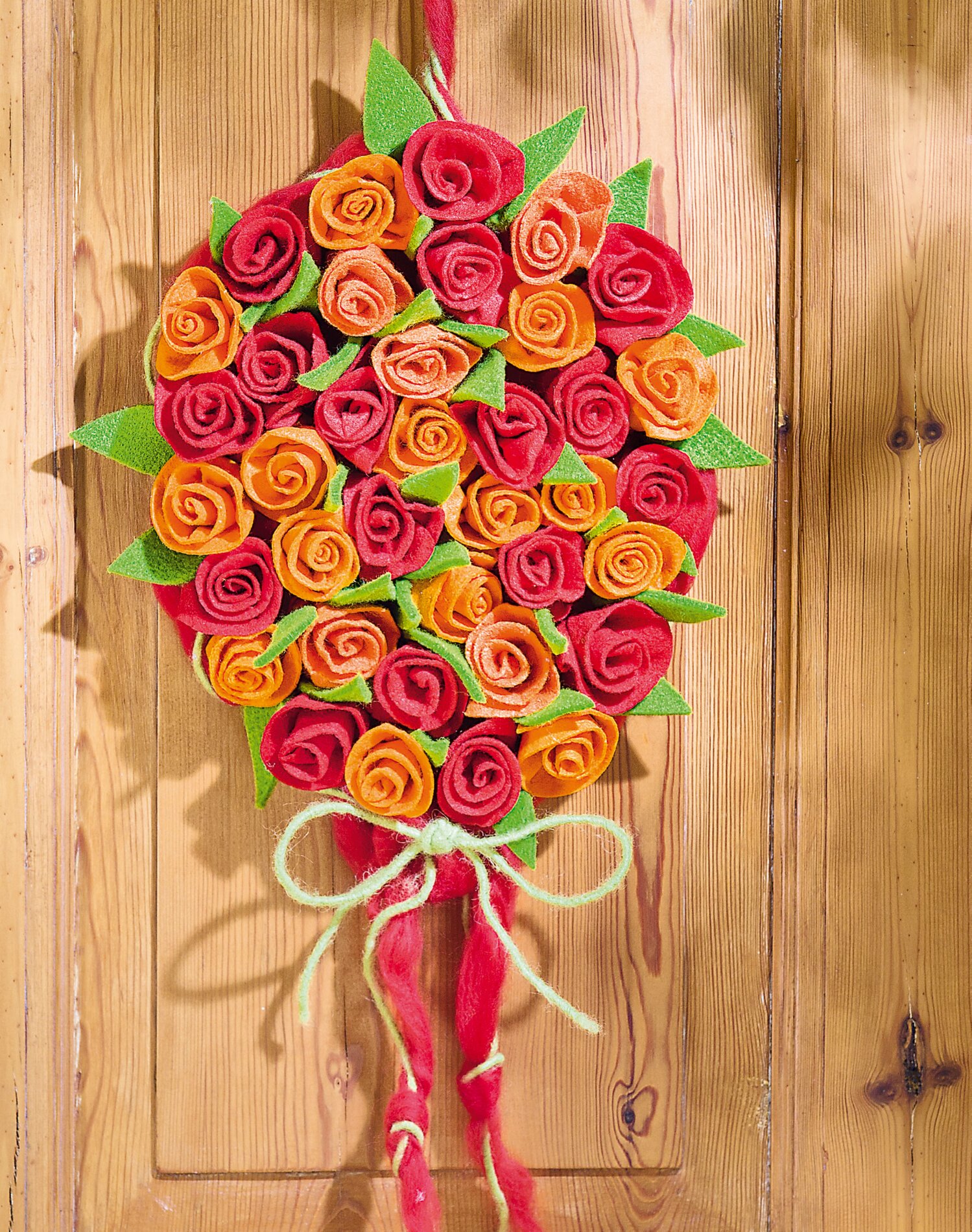 Cut an oval of 2 x 28 cm from the red Textile felt . On this oval Felt sheet the dried felt roses are arranged and glued. First straighten the roses with scissors and glue them on the oval. Additionally fix them from behind with Pins . As soon as the glue has dried well,cut out leaves from the green Textile felt and glue them between the roses.