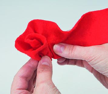 Cut 5 cm wide strips across from the modelling felt with a roll cutter. Pull the strips briefly through the water, then fold in a corner and wind up loosely. About 5 cm before the end of this winding, fold the modelling felt corner downwards, wrap the rose firmly with the seam and fix it. Let this and all further made roses made of modelling felt dry upright in a small glass over night.