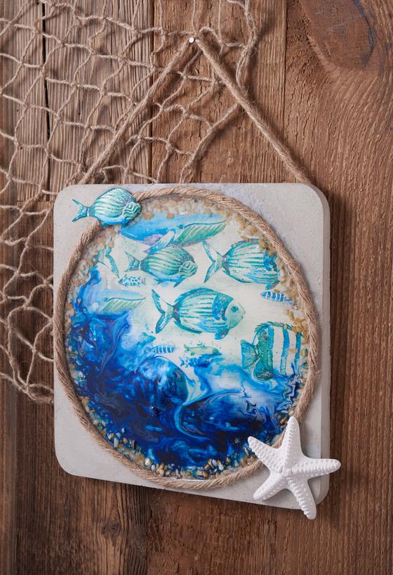A concrete wall painting like an underwater porthole - the motif surface is covered with cold glaze, making the fish look like they are behind glass. Learn here how it works.