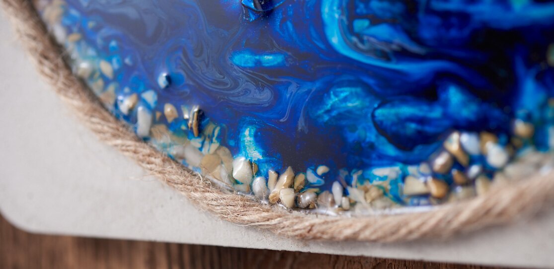 Paint the castings from the "Sea Shells" mould with white glue. Now glue the sisal Handicraft paint. cord around the motif area. Then you can glue the castings to the edge of the picture with or hot Handicraft glue glue. On the back, stick the sisal cord with hot glue.