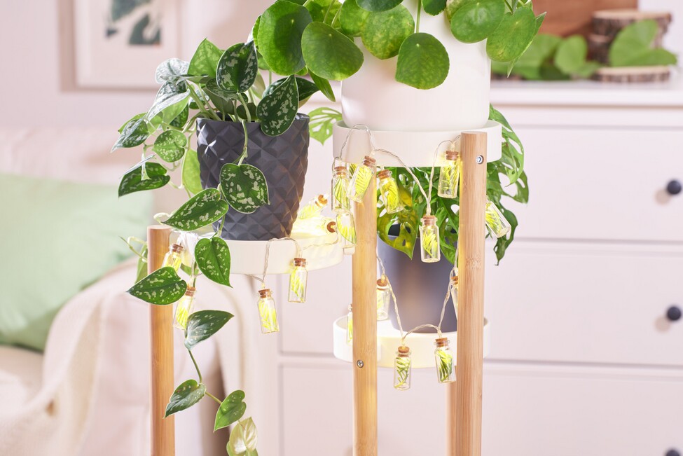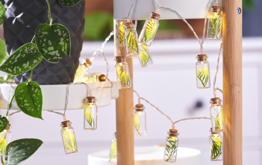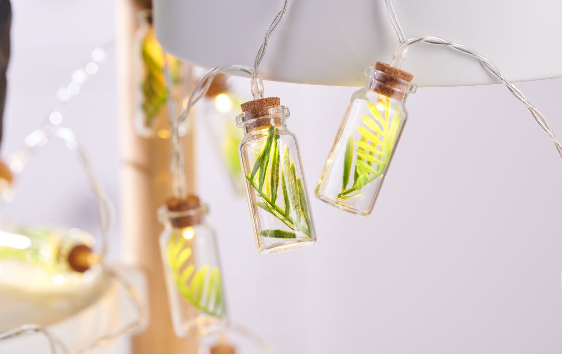 Cut small pieces from the fern and stuff them into each vial. Once the fairy lights are turned on, it will create a warm Urban Jungle light look. Light design, decorate
