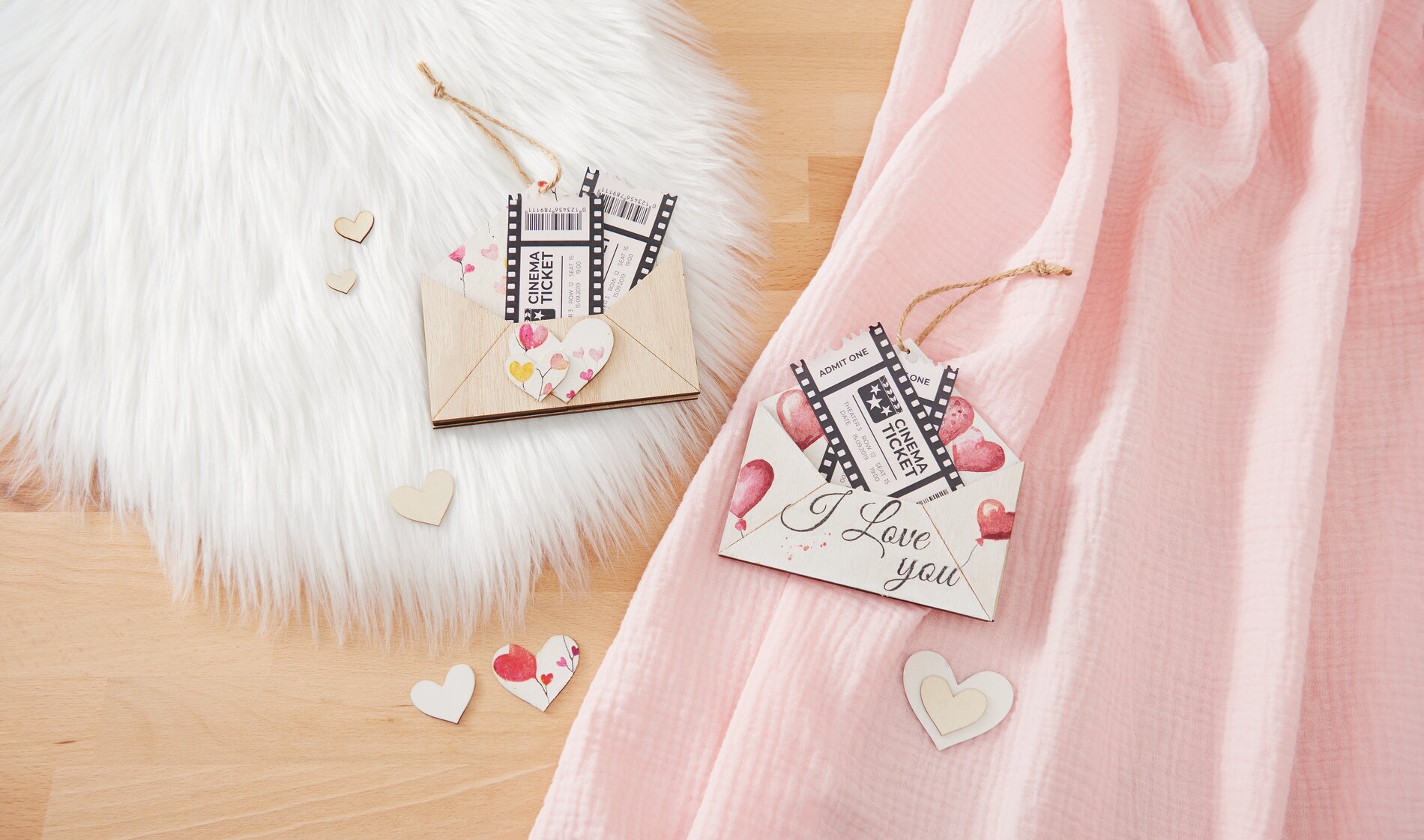 Are you looking for a special, very personal gift for Valentine's Day? Why not lovingly design a wooden envelope with napkin technique and use it as a decorative "gift wrapping" for a movie-Voucher for Valentine's Day. Find out here how you can quickly recreate our idea.