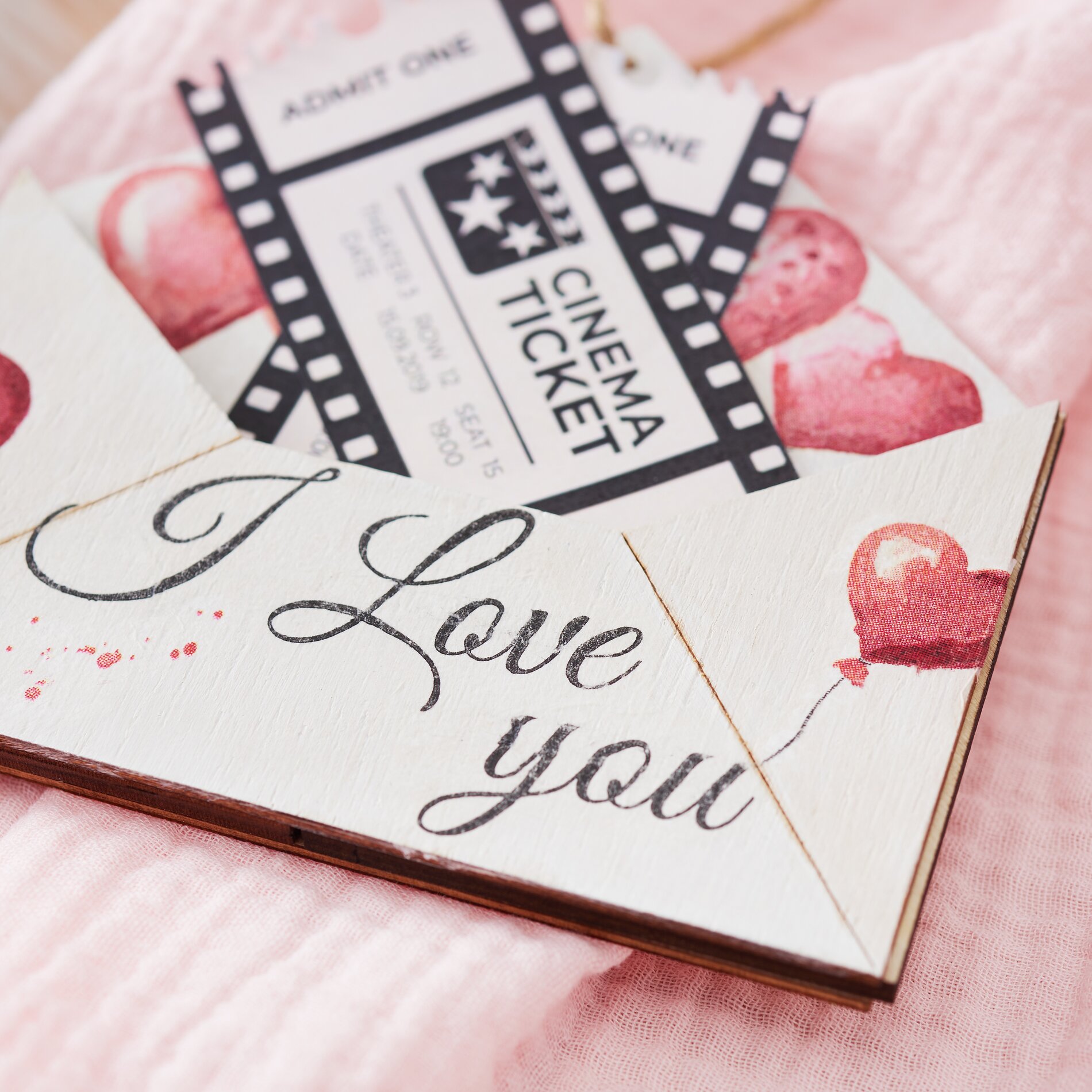 Now you have unique wooden envelopes designed by you, for the Valentine's Day gift only insert a cinema-Voucher , for example!