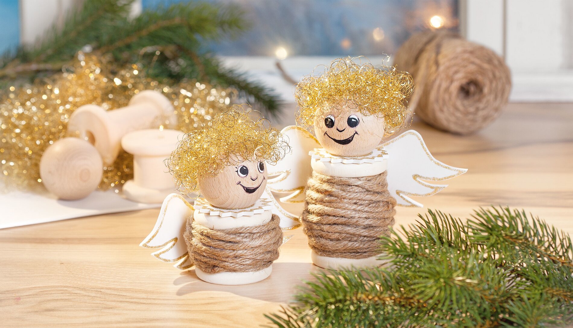 These enchanting angels radiate their very own charm. Made of wooden spools, jute cord and golden flower hair, these two messengers of heaven are created and combine the classic Christmas with the rustic, natural character. With some hot glue, scissors and our VBS Creative set you can create these two angels yourself in a few minutes.