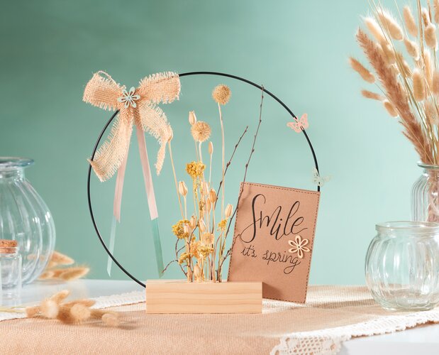 You can create stylish metal rings with dried flowers, color-matching ribbon, beads, natural materials, macramé and much more. With a chic cord, the metal rings can be wonderfully hung from the eyelet in the room and provide a chic home decoration.