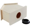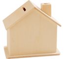 High quality plywood money box in the shape of a house. The money box is closed at the bottom with a rubber closure. It is about 10.5 cm wide, 10 cm high and 5.5 cm deep.