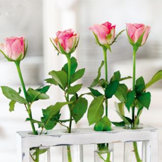 A vase with a frame of raw wood and test tubes of glass. You can design the frame very easily with techniques such as the Décopatch or Napkins-technique or work with colours. The test tubes are an unusual vase element and the arrangement allows for completely new flower arrangements.