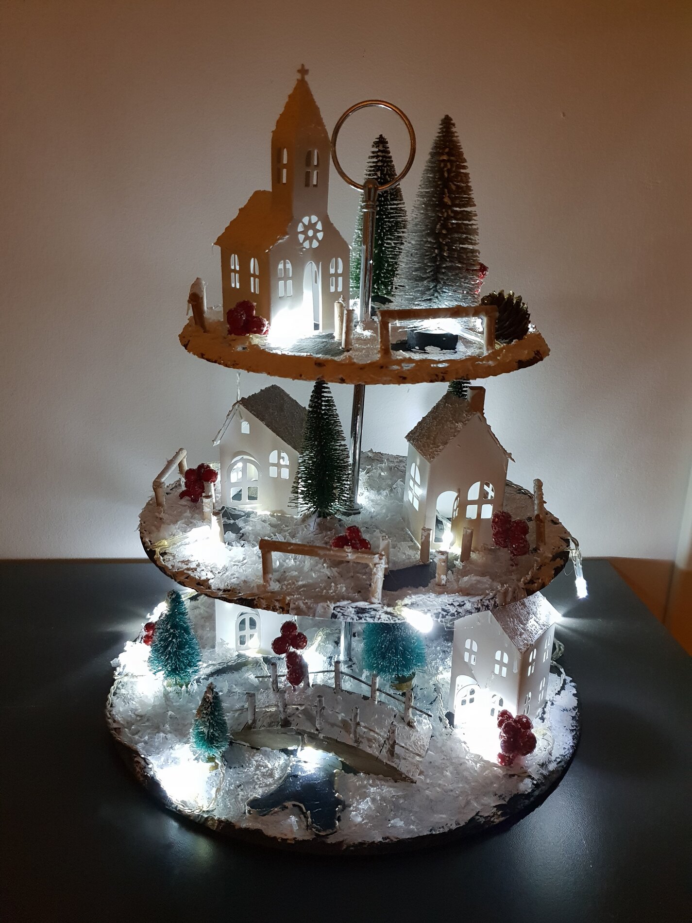 As a basis are suitable all Etagere. It is up to you to decide what size your winter village should have. With a Spatula you can make decorative snow on the individual floors of the Etagere distribute. You can also spread some loose Diamond-snow on the freshly applied paste