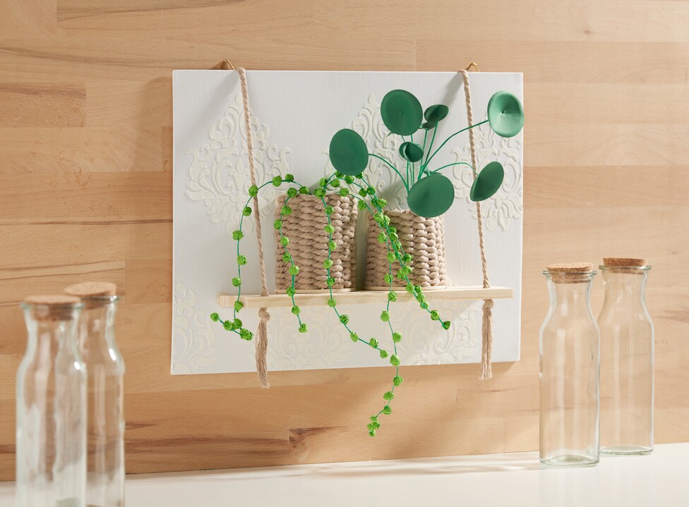 Also with mosaic glue fix and the two woven pots on the board. Add plug-in foam and arrange the paper plants. Finally, glue picture eyelets as a suspension to the back of the painting board.