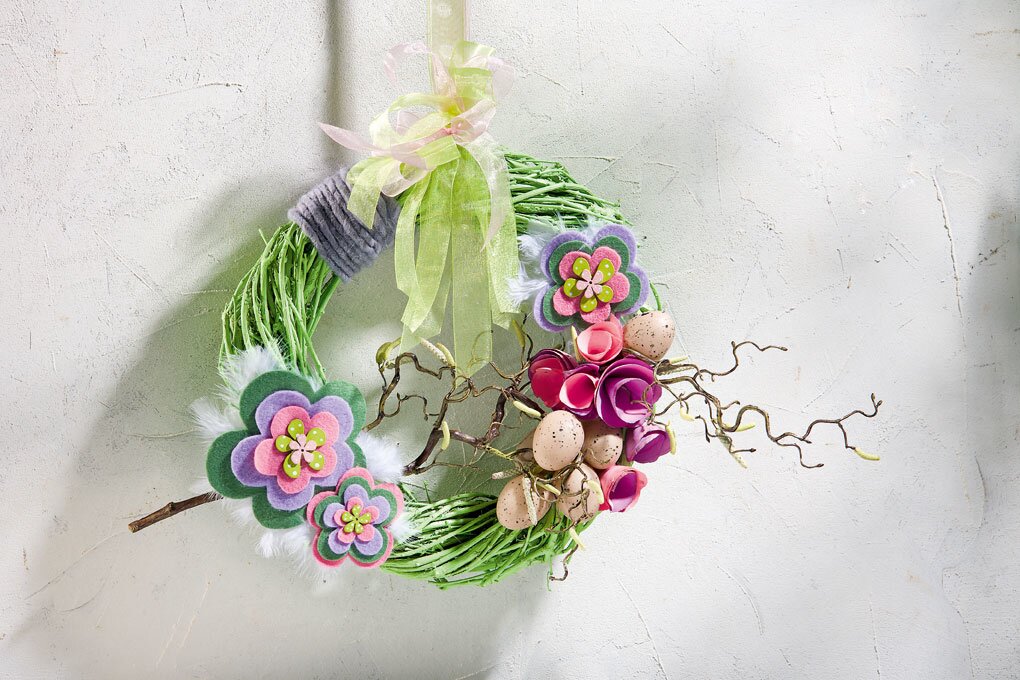 This large, green wicker wreath is decorated with colourful felt flowers and twisted chip flowers. The bright colours are harmoniously complemented by the natural eggs and the twig.