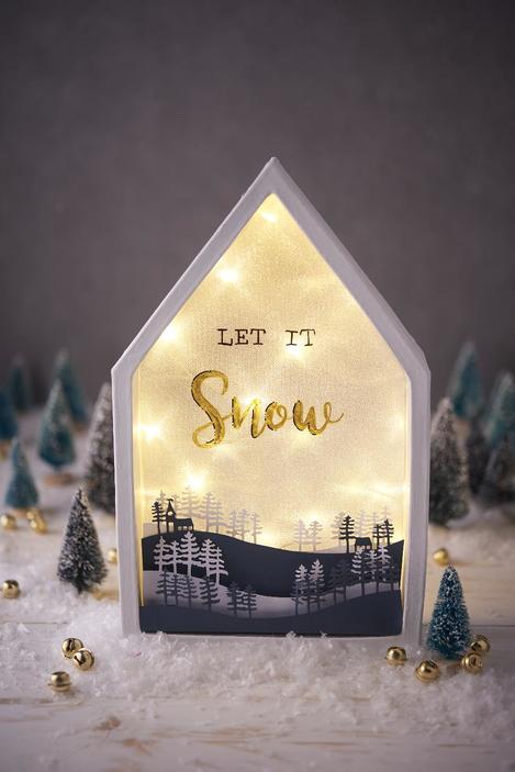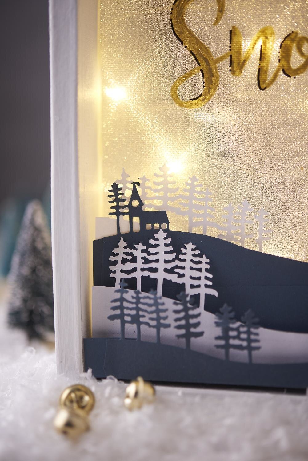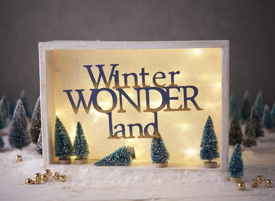 Paint the wooden font Winter Wonderland with dark blue and gold paint. Hang it with a nylon thread in the cardboard frame and fix it