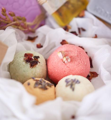 Form the balls by hand, use the bath ball former as a size measure first, put the hand formed balls into the bath ball former, shakethe form slightly. This will make the balls even rounder, and the mixed mass will not stick to the mould. Finally, decorate the bath balls with rose petals and lavender flowers.
