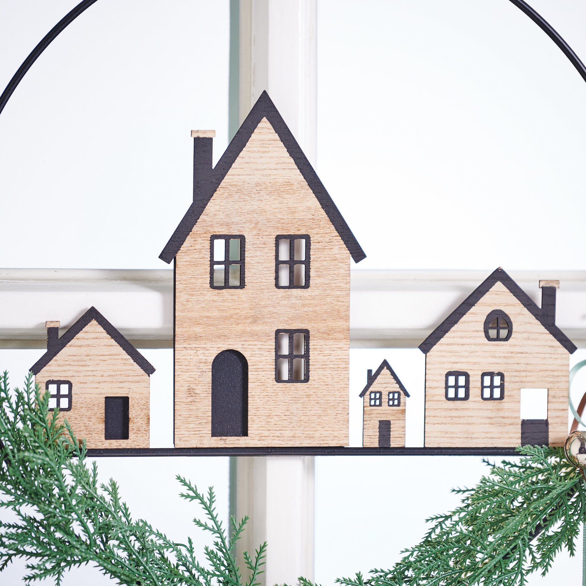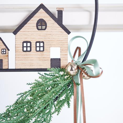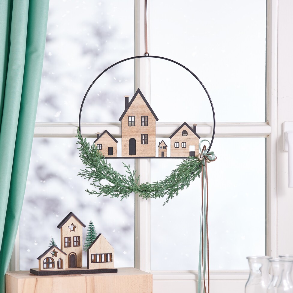 The basis for the window decoration is a black metal ring, Ø 30 cm. The decorative house front is already permanently installed, and a hanging loop guarantees that everything will hang perfectly.