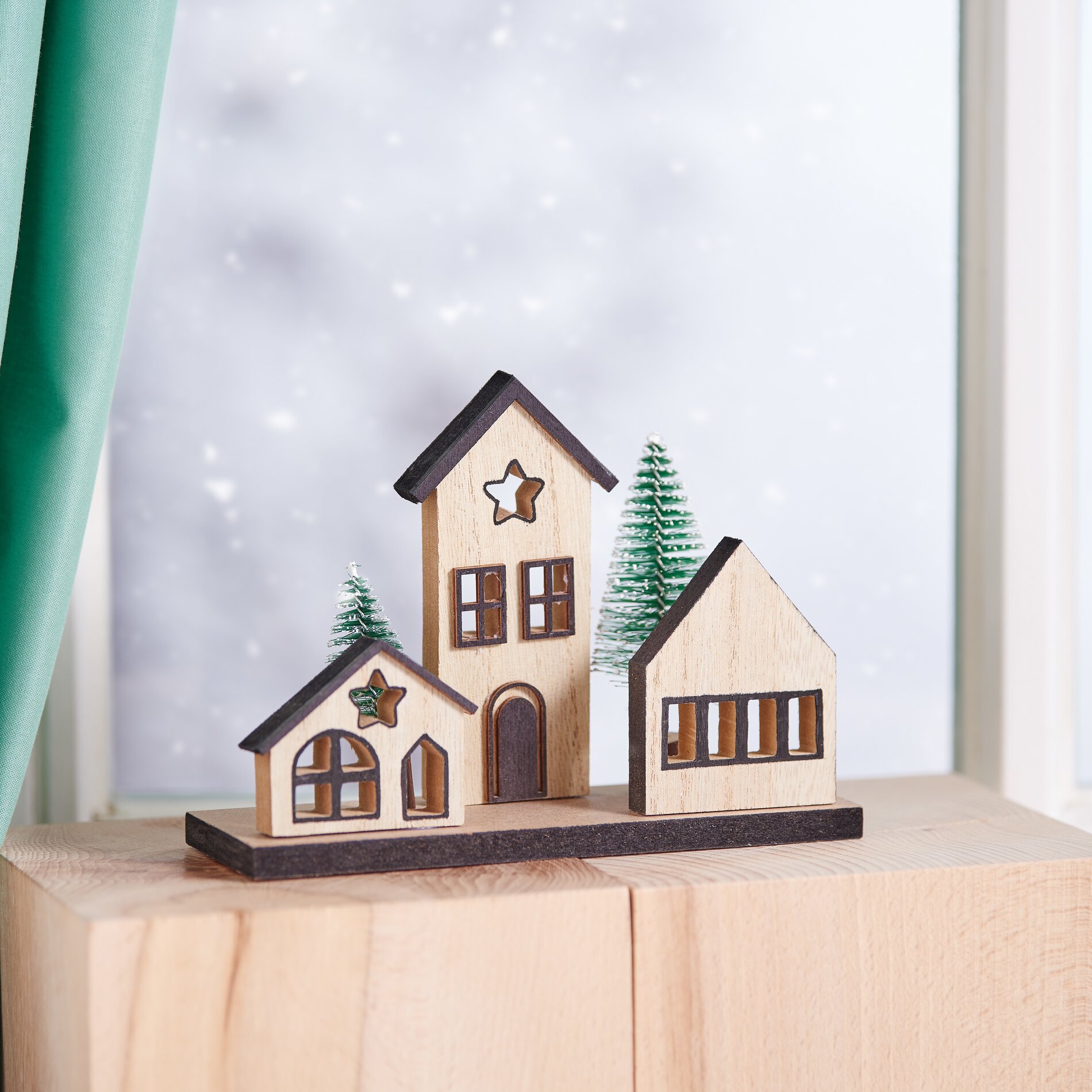 Match the look of the wooden construction kit to the decorative ring: Paint the roofs of the houses with a black marker. You can also highlight the windows, doors and stars with black .