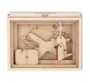 A wonderful Wood building kit piggy bank "Journey", consisting of 12 individual parts for plugging together. The money box has a length of 11.5 cm, width 5 cm and height 8.5 cm. The material is high-quality plywood.