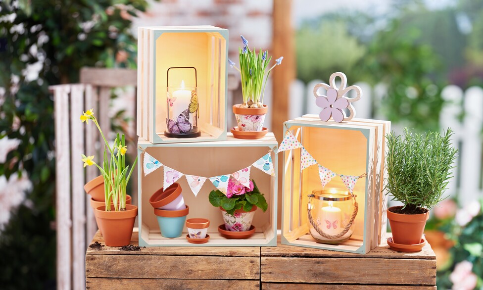 With a decorative wooden crate arrangement in the garden or on the patio, you can quickly create a small oasis of well-being. Atmospheric lanterns go perfectly with this and complement your outdoor ambience wonderfully. Our simple instructions show you how to use creative techniques to design unique terracotta-pots and lanterns.