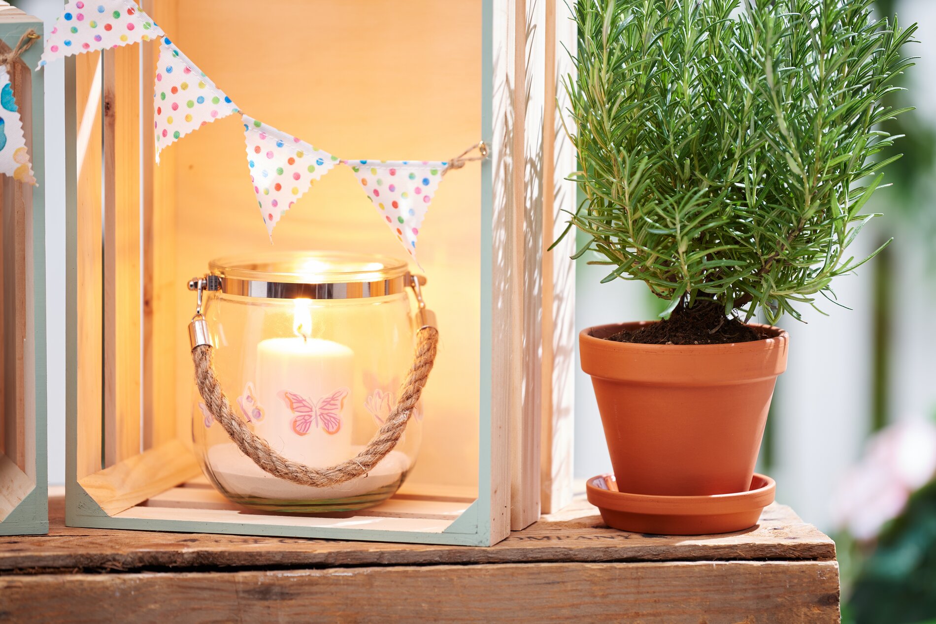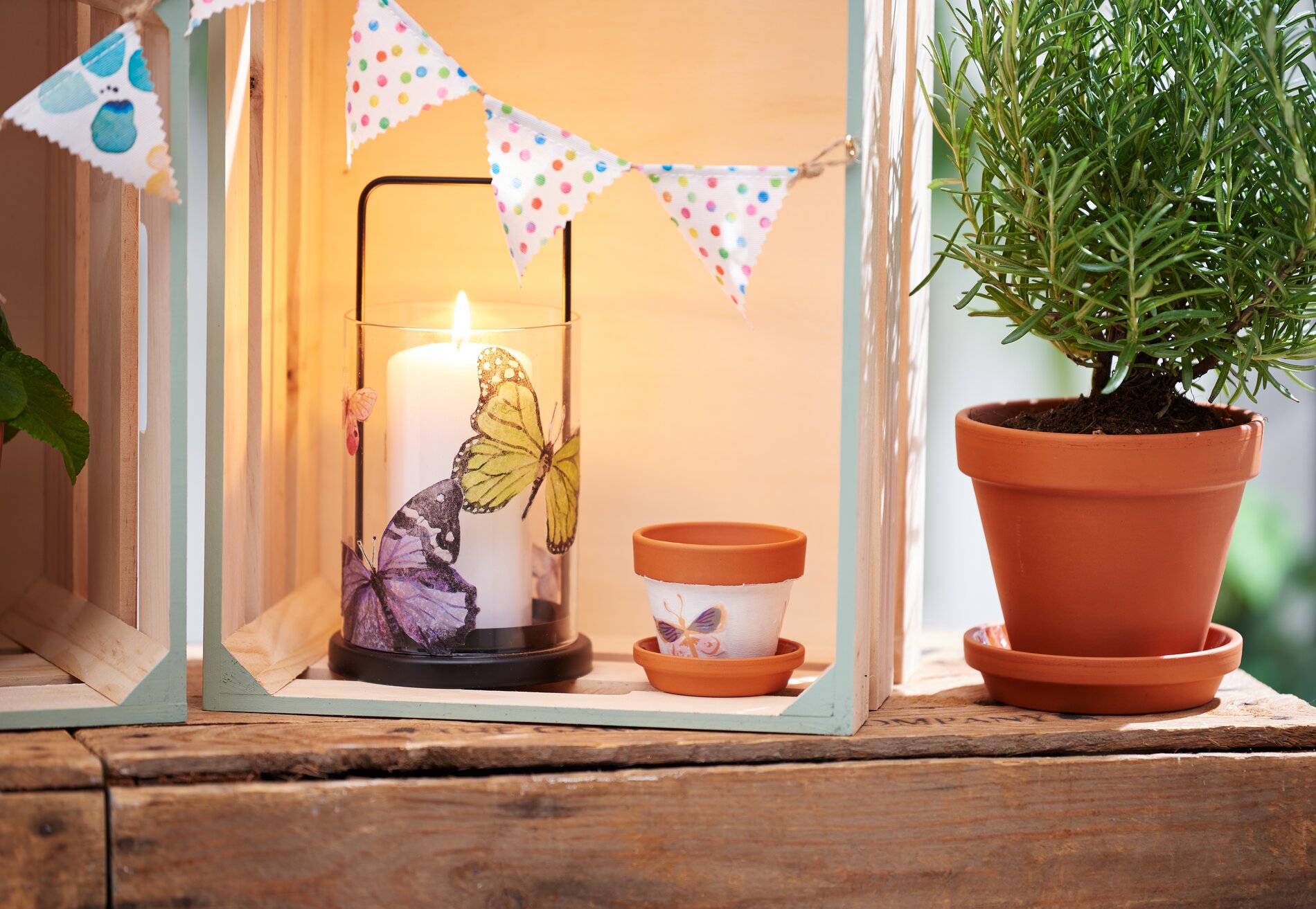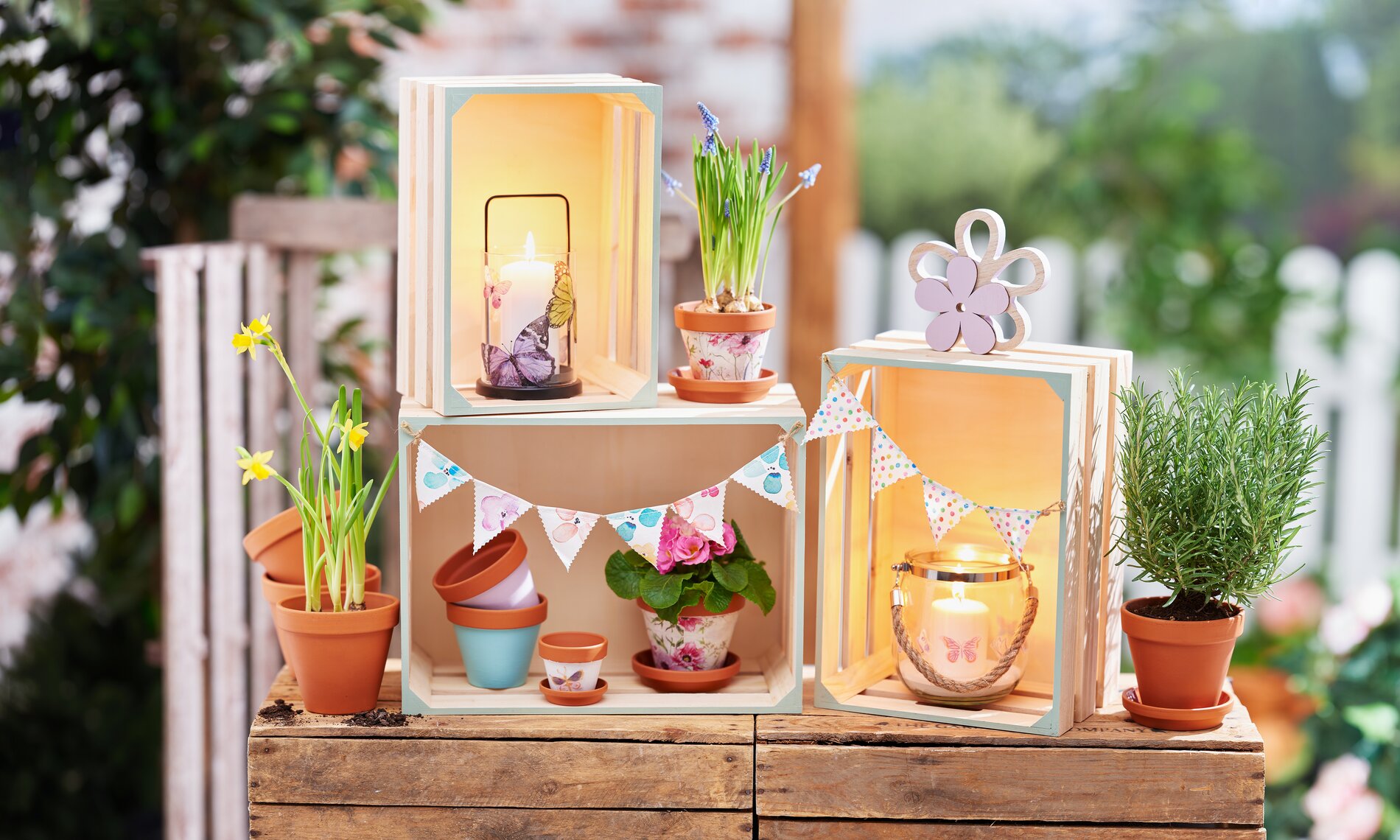 Have you already chosen a small space outside for your feel-good decorations? Arranging your handmade lanterns and clay pots together with the wooden crates and other planted pots is a lot of fun.