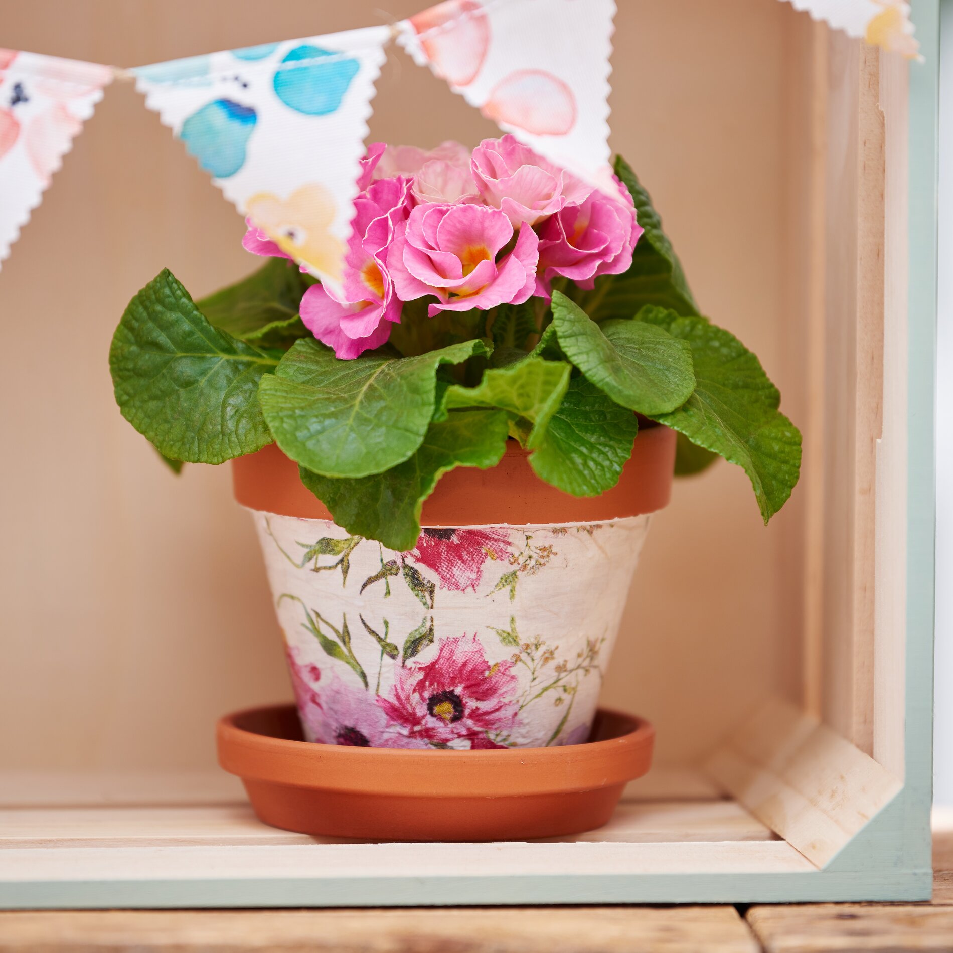 Before you decorate terracotta pots with napkin technique , prime them with white handicraft paint. The printed motifs of your chosen napkin will be clearly visible on the terracotta later thanks to the light background.