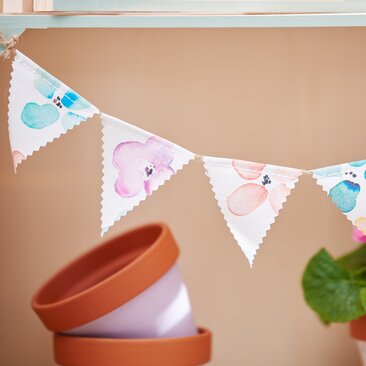 Use the template to make the small pennant garlands. Download it and transfer it to fabric. Cut out the pennants with zigzag scissors. Fold the fabric at the seam allowance for each pennant, place a jute cord between all the pennants and staple everything together briefly (also works well with paper clips). Sew everything together. Attach eyelets to the wooden crates and hang the pennants from these eyelets.