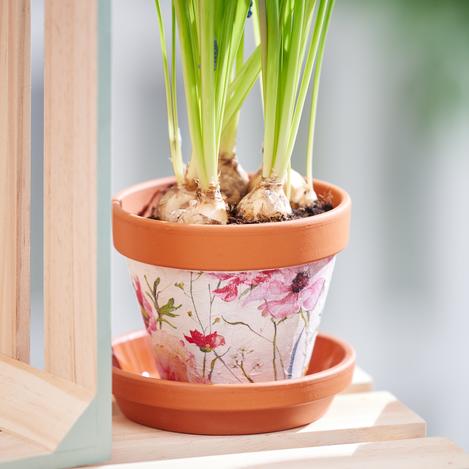 The napkin technique on the clay pots can be done in the same way as the napkin technique on the glass. Here, however, it is not important to pay attention to any protruding paint residue, because after sticking on the napkin motifs, you coat the entire terracotta surface with the napkin varnish. This gives it an even look and a protective varnish.