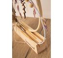 A Wooden stand for rings with a size of approx. 20.0 x 4.8 x 5.0 cm. Ideal for inserting metal rings and metal shapes with a max. Ø of approx. 3 mm or bamboo rings with a max. thickness of approx. 1 cm. The two slots for inserting the rings have a size of approx. 0.32 x 1.0 cm (hole depth), becoming wider towards the top with approx. 1 x 1 cm. The total depth of the slots is 2 cm. Customizable with branding, craft paints, hand lettering and much more.