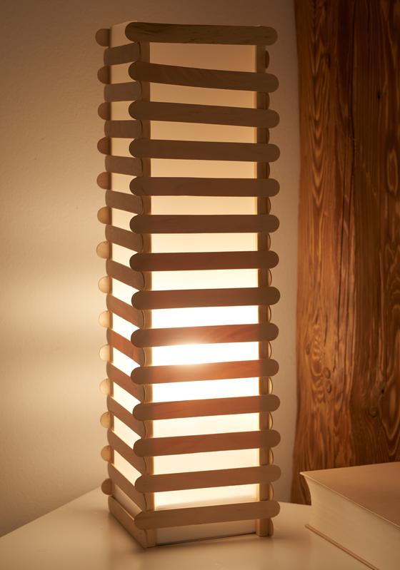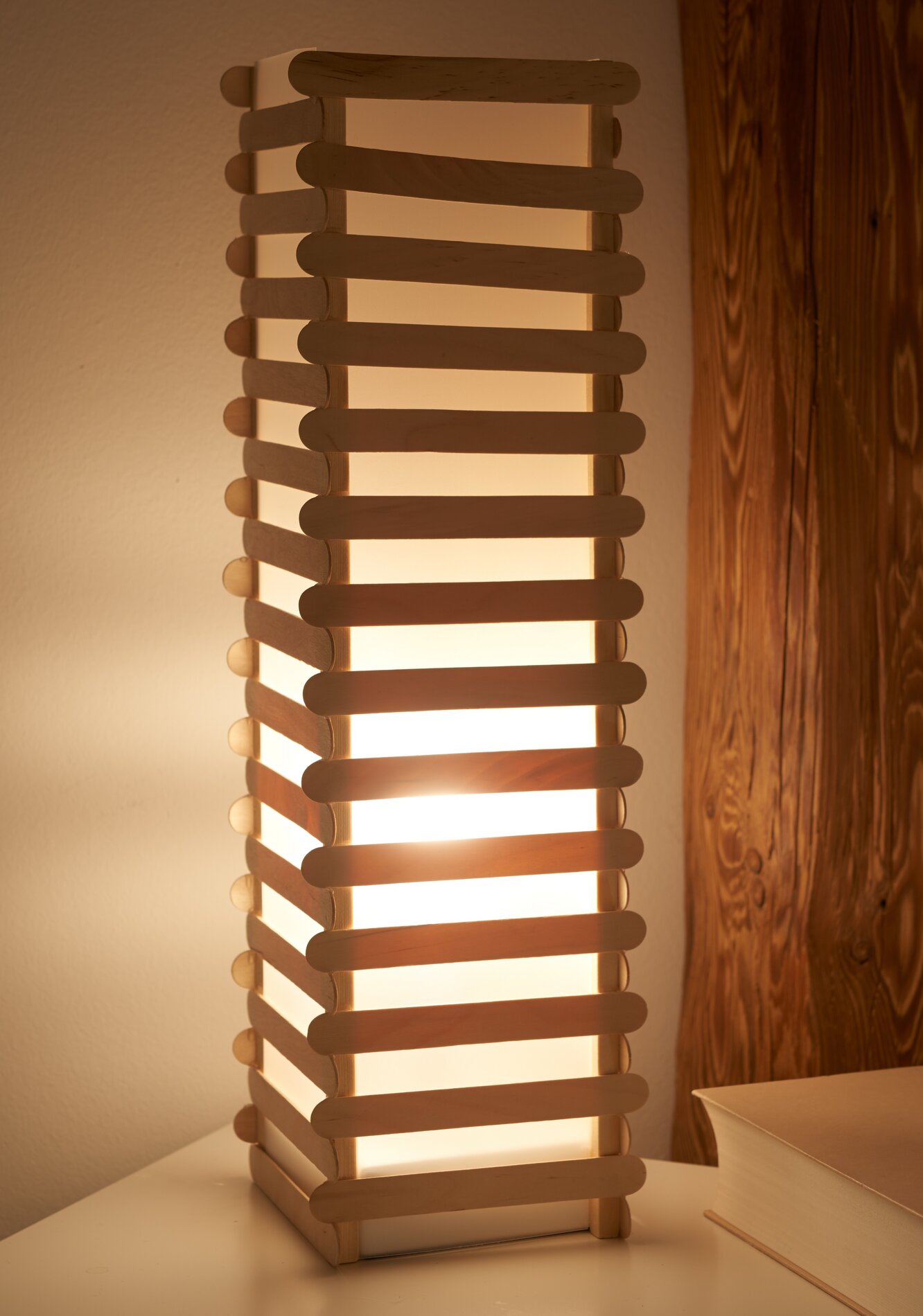 By gluing the wooden spatulas across and staggered on the square strips, you will get the attractive striped look of the table lamp.
