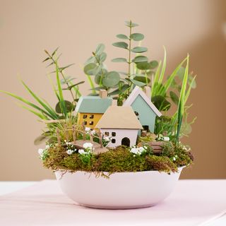 Different materials and decorative items such as moss, berries, artificial flowers, dried flowers, plastic eggs, sprinkles, ribbons and much more are great to tinker with. Filled with sand and designed with miniature objects and wooden elements create detailed miniature landscapes and mini-gardens. A super decoration for the entrance and the garden.