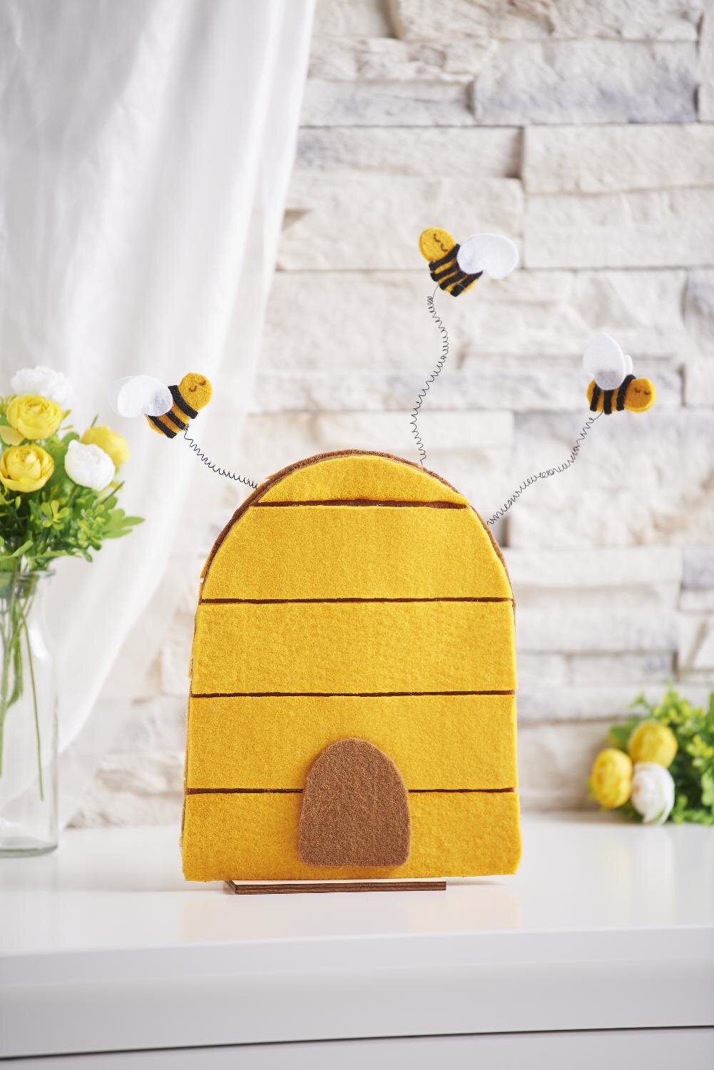 Przyklej dwa filcowe ule z przodu i z tyłu. Zacznij od przyklejenia żółtych pasków, a następnie umieść brązowe drzwi.