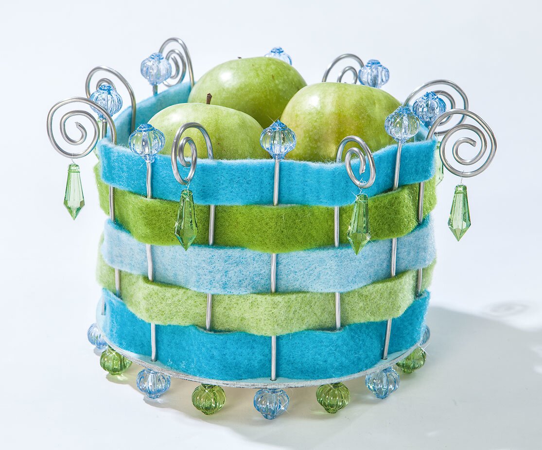 Przetnij filcowe wstążki na pół wzdłuż i przepleć je na przemian w kolorze niebieskim i zielonym przez drucianą ramę, mocując końce gorącym klejem.