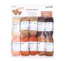 Włóczka do szydełkowania Gründl Cotton Quick Mini "Shades of Brown" to kompilacja 10 kłębków w różnych odcieniach kolorów od beżowego przez pomarańczowy do ciemnobrązowego. Każdy kłębek ma masę ok. 15 g i długość ok. 37,5 m. Wykonane w 100% z bawełny, merceryzowane, gazowane i czesane.