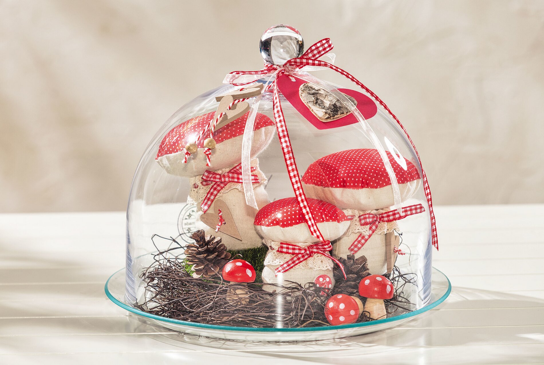 Stwórz małe gniazdo na szklanym talerzu , używając nici dekoracyjnej i mchu . Umieść grzyby z tkaniny razem z małymi szyszkami i mini grzybami dekoracyjnymi, aby stworzyć naturalną aranżację. Upewnij się, że szklana pokryw ka pasuje do dekoracji.