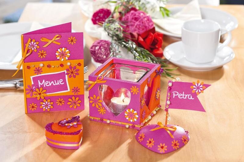 Ci, którzy lubią rzeczy nieco bardziej nietypowe, pokochają te dekoracje stołu w kolorze pomarańczowym i różowym. Karta menu, lampka na stół, pudełko w kształcie serca i tabliczka z imieniem są ozdobione dziurkowanymi kwiatami. Perły i satynowe wstążki dodają kolorystyki.