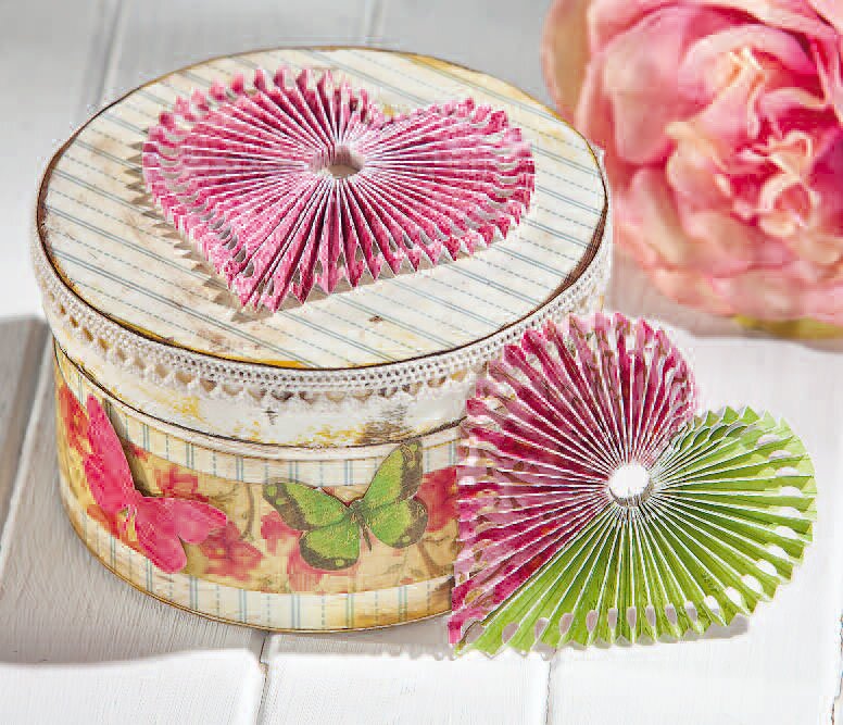 Aby uzyskać serce, dwukrotnie wytnij szablon z papieru za pomocą maszyny do wytłaczania i dziurkowania. Złóż dwa paski jak akordeon i sklej je taśmą na końcu.