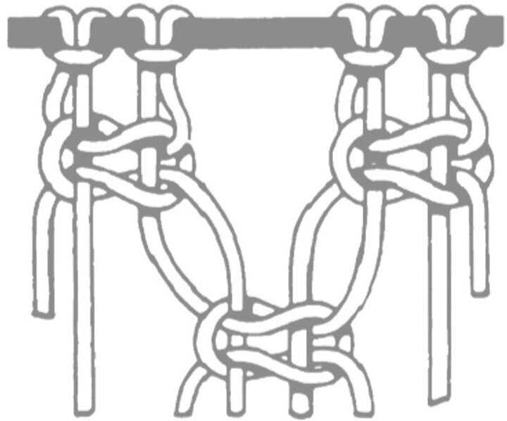 W następnym rzędzie pozostaw pierwsze dwie nitki na miejscu i rozłóż węzły. W następnych rzędach ponownie rozłóż węzły i zabezpiecz każdy z nich gorącym klejem.