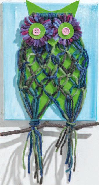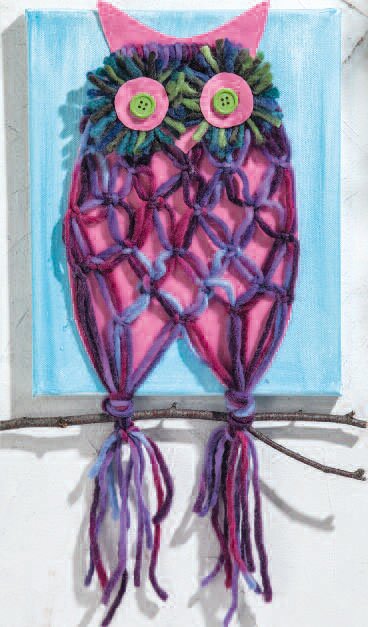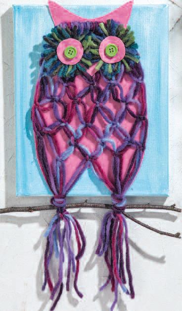 Teraz zawiąż pierwsze cztery nitki na zewnętrznym konturze sowy węzłem tkackim, a następnie zawiąż kolejne węzły tkackie w poprzek kształtu. Zabezpiecz poszczególne węzły gorącym klejem.