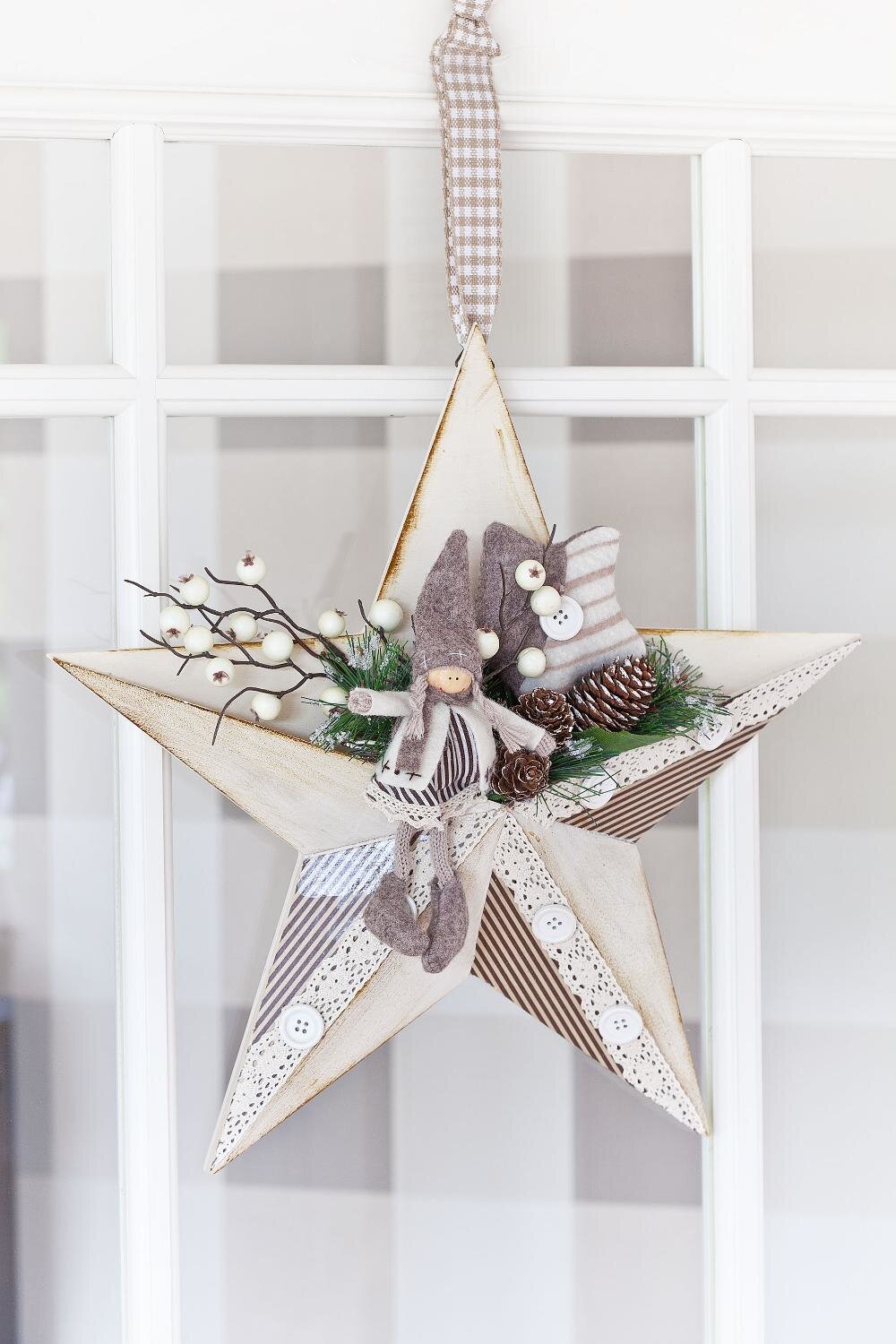 Na koniec przeciągnij wstążkę, skróconą do pożądanej długości, przez oczko. Teraz Twoja gwiazda jest gotowa i możesz umieścić ją w centrum uwagi.