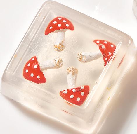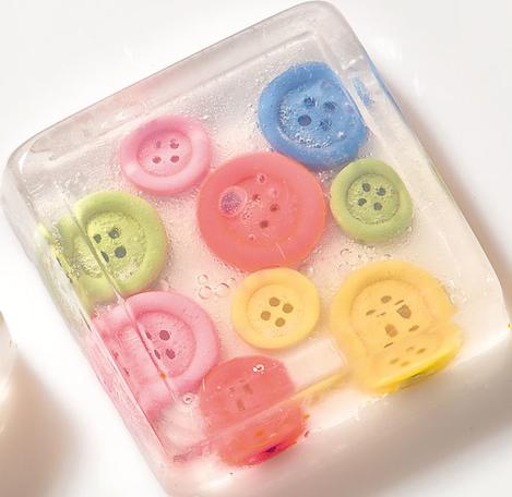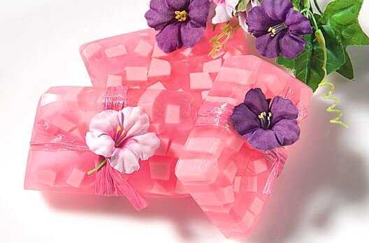 Tworzenie przezroczystego mydła z wtrąceniamiRozpuść całe przezroczyste mydło z formy w kuchence mikrofalowej zgodnie z instrukcją i dodawaj po kropli różowy barwnik do mydła. Rezultatem jest przezroczysty, bladoróżowy kolor. Olejek zapachowy można dodawać do mydła kropla po kropli, zgodnie z własnymi preferencjami.
