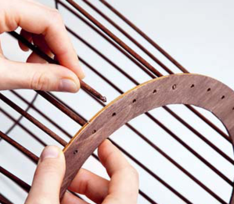 przymocuj pierścień lampy 33 cm od dolnej krawędzi do wewnętrznej strony sześciu okrągłych prętów za pomocą brązowego sznurka, tymczasowo nasuń drugi pierścień na okrągłe pr ęty, aby były wygięte w prawidłowy kształt do tkania.