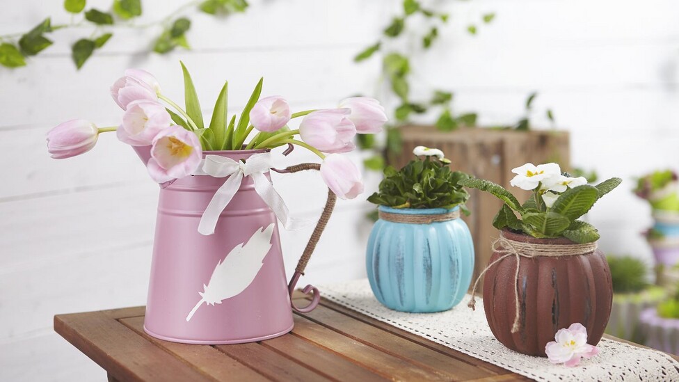 Aby wykonać motyw "piór" na doniczce, pobierz nasz szablon motywu. Wytnij szablon, spryskaj go klejem w sprayu i umieść motyw na dzbanku. Szklane wazony