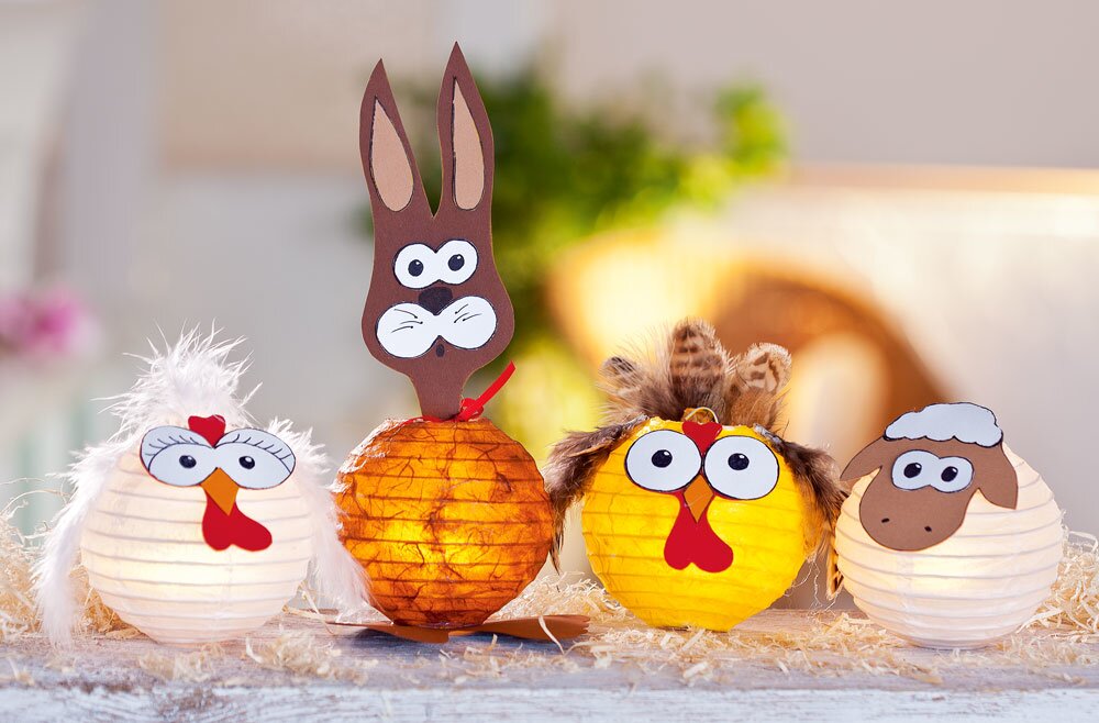 Wystarczy odrobina wysiłku, aby szybko wykonać zabawne figurki zwierząt z papierowych lampionów i słomianego jedwabiu. Niniejsza instrukcja zawiera szablon, który pomoże ci wykonać głowy króliczków, kurczaczków i owieczek. Zabawne motywy kurczaczków, owieczek i zajączków pasują do każdej wielkanocnej dekoracji, a także są mile widzianym pomysłem na prezent.
