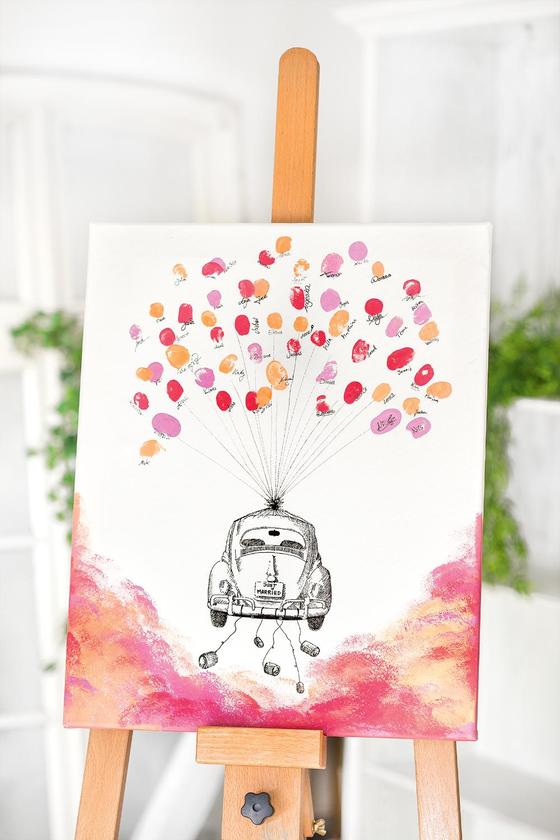 Po wyschnięciu latający samochód ślubny jest gotowy na wielkie przyjęcie weselne: goście mogą teraz nałożyć odrobinę koloru na opuszki palców i pozostawić "balonowy" odcisk na żuku. Aby uzyskać jeszcze ładniejszą pamiątkę, niech każdy z was podpisze się swoim imieniem!