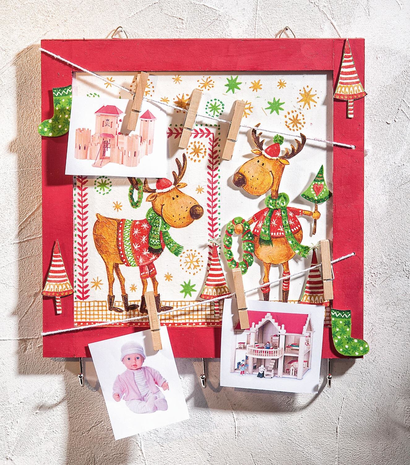 Dzięki tej wspaniałej tablicy życzeń na pewno dostaniesz prezenty! Zabawne łosie są przyklejone do drewnianej tablicy za pomocą techniki serwetkowej, a spersonalizowane życzenia są po prostu przymocowane do małych drewnianych klipsów.