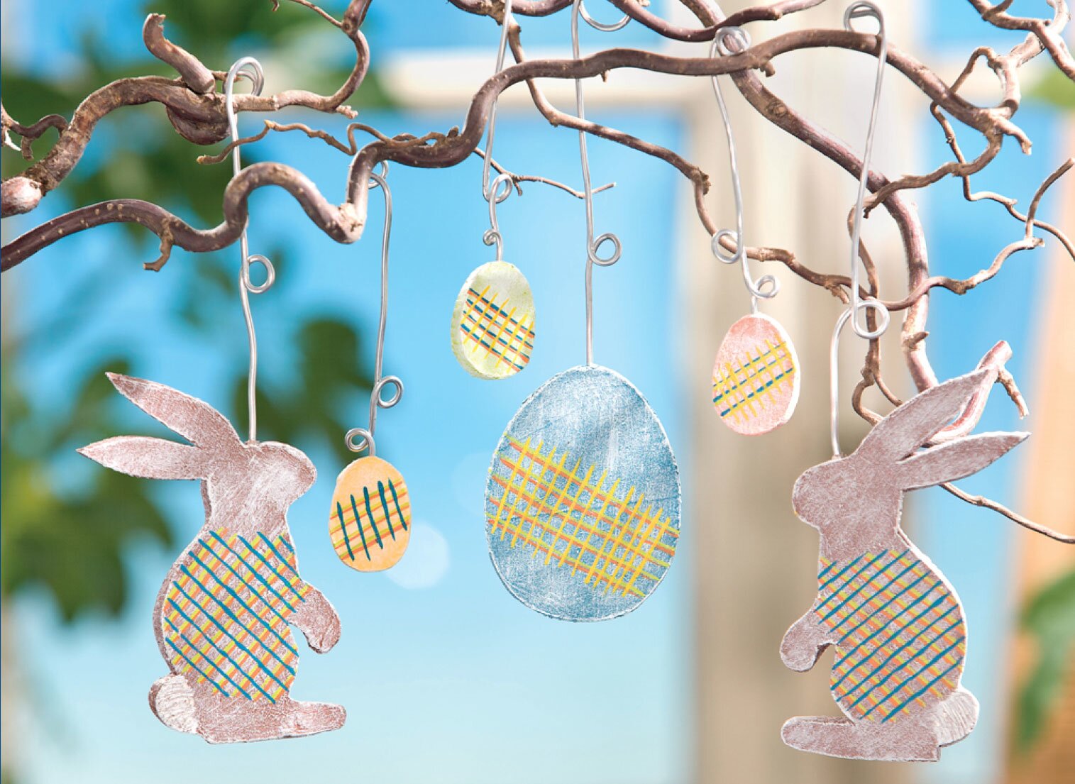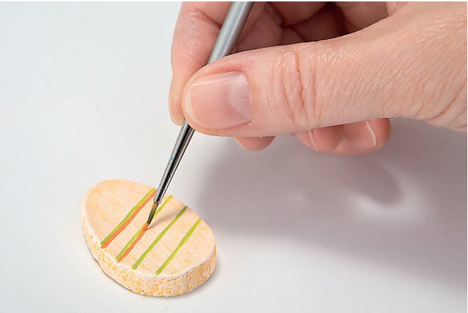 Króliczki są zagruntowane mieszanką kolorów brązowego i pomarańczowego, a jajka w kolorach jaskier, majowa zieleń i lazurowy błękit.Po wyschnięciu farby wszystkie figurki są "szczotkowane" białą farbą rzemieślniczą, tj. rozcieńczona biała farba jest ostrożnie wycierana gąbką. Teraz namaluj szachownicę za pomocą cienkiego pędzelka.Przytnij drut aluminiowy do odpowiedniego rozmiaru, zamocuj w otworach za pomocą kleju superglue i wygnij do pożądanego kształtu po wyschnięciu.