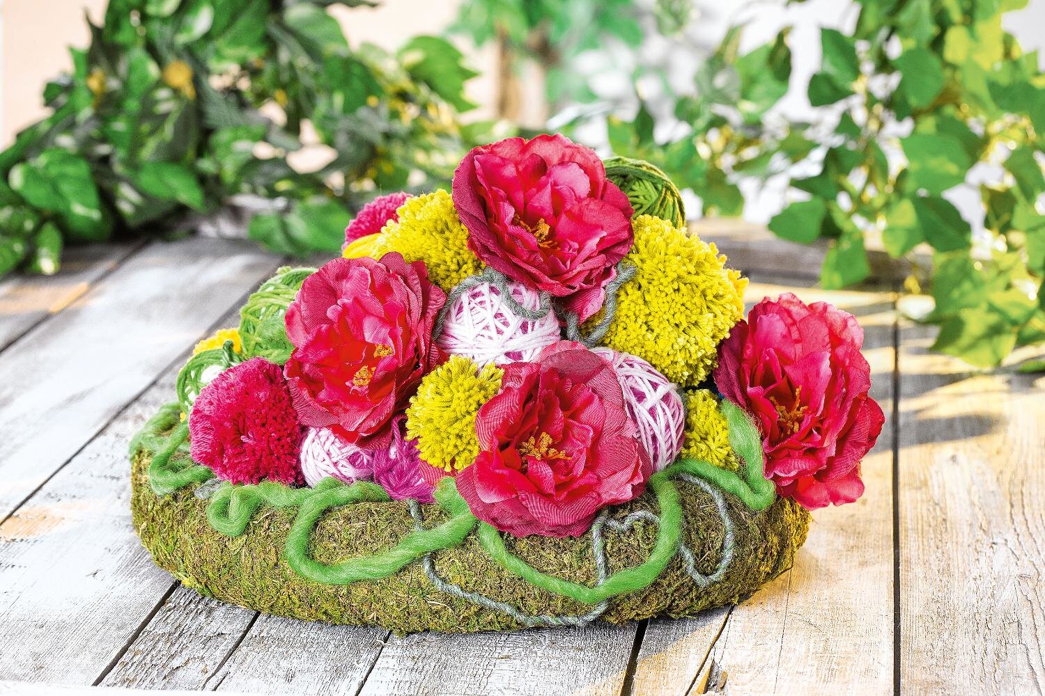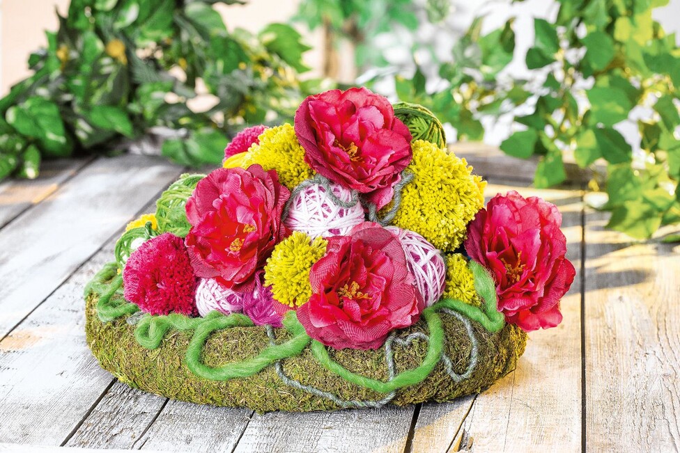 Teraz możesz ułożyć kolorowe wełniane kulki i pompony w kształcie piramidy na wieńcach z mchu za pomocą drucików korkowych. Na koniec przytnij łodygi róż za pomocą nożyka bocznego i dodaj kwiaty do swojej kreatywnej aranżacji.