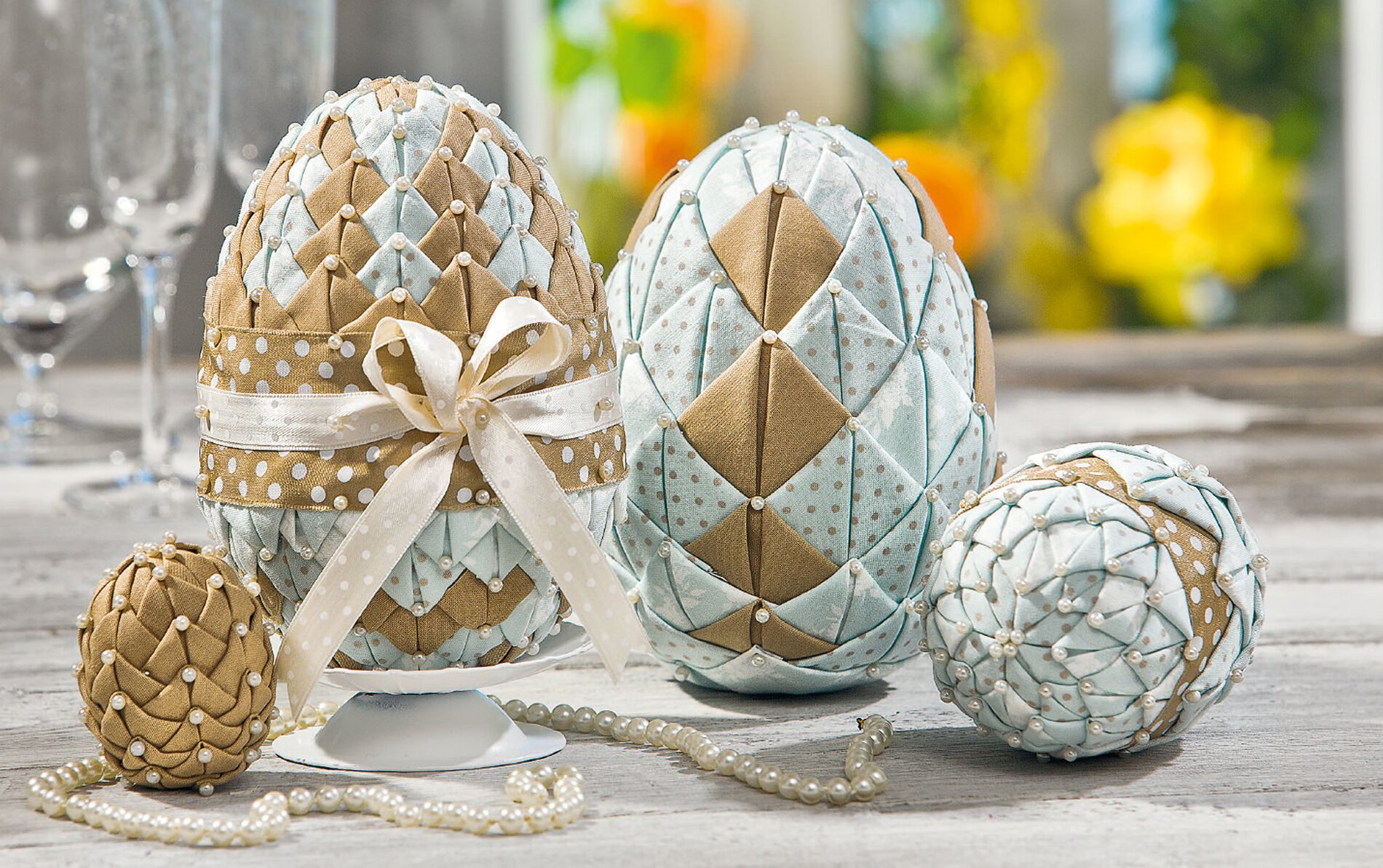 Do wykonania jajek karczochów potrzebne będzie 30 cm gładkiej tkaniny bawełnianej w kolorze jasnobrązowym, 30 cm kontrastującej tkaniny w pasujących kolorach ze wzorem, szpilki, styropianowe jajka w rozmiarach 6 cm, 10 cm i 16 cm, szpilki z ozdobną główką, pasująca wstążka i - jeśli jest dostępny - świecznik z kolcem.