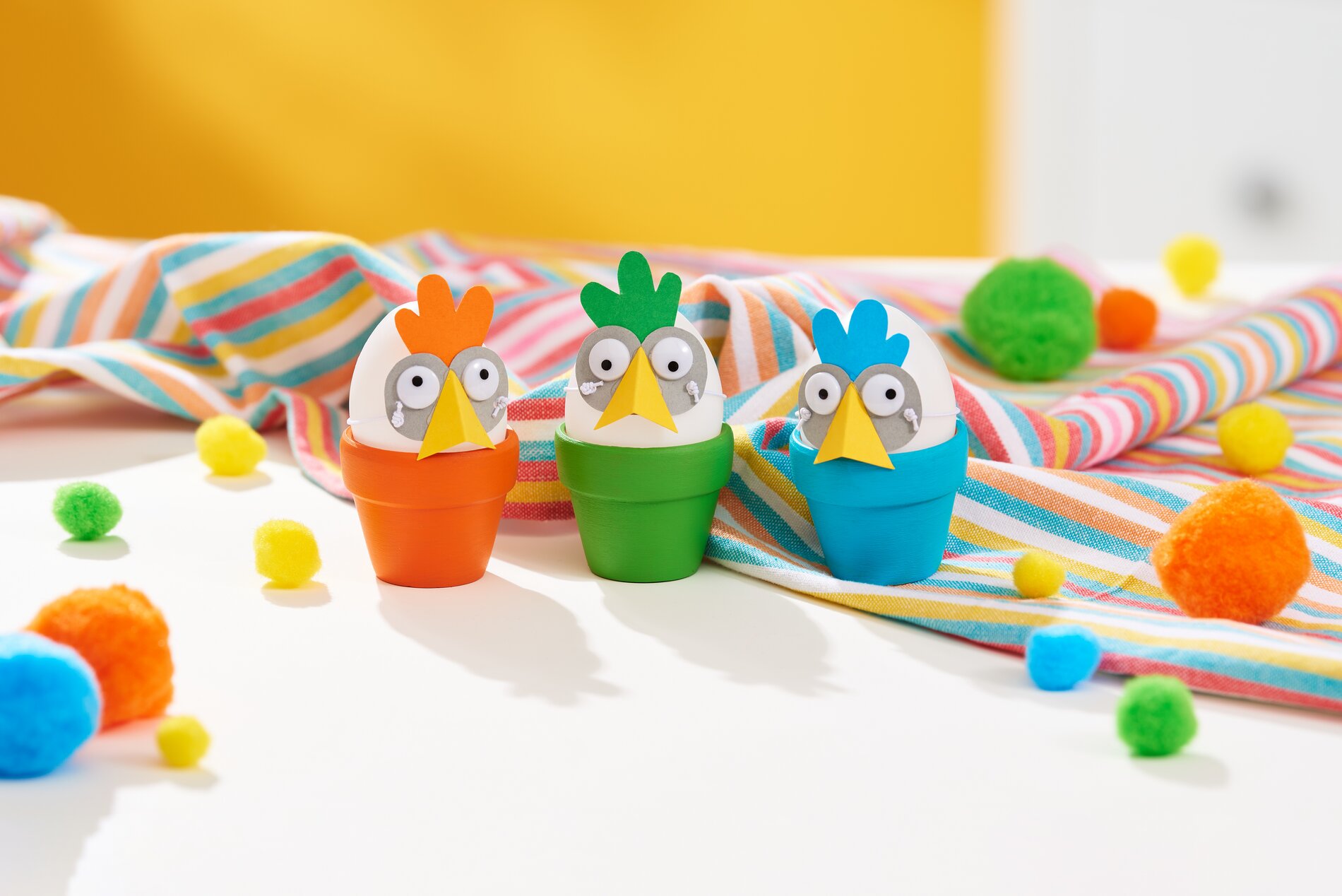 Zrób dwa otwory po bokach za pomocą dziurkacza. Użyj do tego najmniejszej nasadki. Odetnij około 15 cm sznurka i zawiąż trzy węzły na jednym końcu. Dzięki temu sznurek nie prześlizgnie się przez otwór. Przeciągnij niezawiązany koniec sznurka przez jeden otwór i przełóż go do drugiego otworu. Tam zawiąż trzy węzły, aby zabezpieczyć wszystko na miejscu. Jeśli chcesz, możesz teraz pomalować gliniane doniczki na kolorowo. Po wyschnięciu jajka można umieścić w doniczkach.