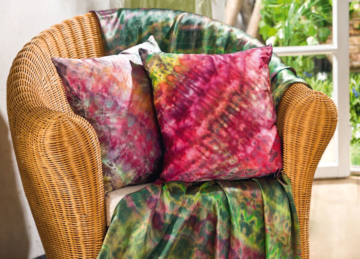 Dzięki wysokiej jakości farbom do jedwabiu i odpowiednim technikom, nie jest wcale trudno przekształcić białą tkaninę w dekoracyjne, unikalne elementy. Tutaj poszewki na poduszki i narzuty są tworzone przy użyciu zaledwie 3 różnych kolorów farb do jedwabiu utrwalanych parą. Pomysłowa technika owijania i utrwalania w kąpieli wodnej tworzy fascynujące efekty kolorystyczne i wzory.